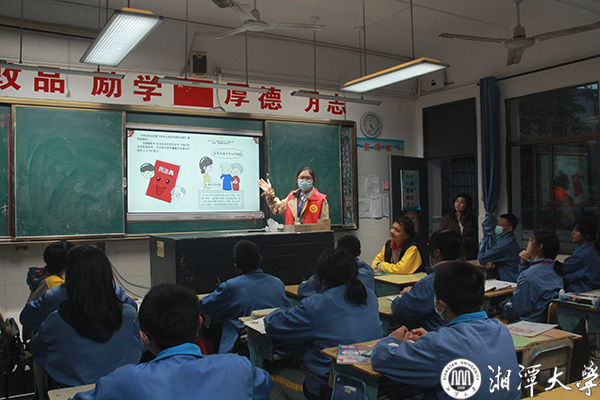 本次法治月活动中,yl23455永利官网青年志愿者服务队走进湘潭市第十六中学、益智中学、曙光学校、湘潭市第十二中学、湘潭大学附属实验学校等中小学开展普法,志愿者们当上了“小老师”,以案释法、深入浅出,为同学们宣讲了现行《宪法》40年的发展历程以及《民法典》《未成年人保护法》《刑法》《治安管理处罚法》等相关条文。
