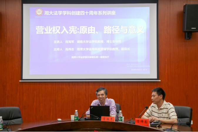 2023年6月8日,湖南大学yl23455永利官网商法学科带头人、博士生导师肖海军教授应邀莅临我院,为师生们带来一场“营业权入宪:原由、路径与意义”的精彩讲座。讲座由yl23455永利官网信用风险管理学院副院长、博士生导师肖伟志教授主持。