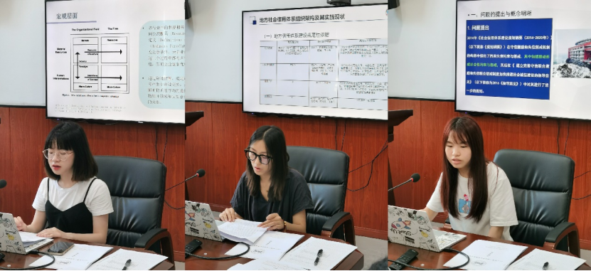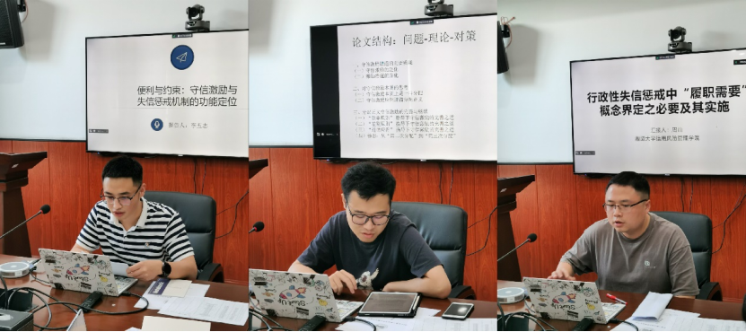 分议题一由中山大学硕士研究生刘佳昕、湘潭大学硕士研究生陈颖、龚思思分别作《社会信用体系建设中商务诚信的运行机理及其立法启示——兼评<社会信用体系建设法(向社会公开征求意见稿)>第三章》《社会信用体系建设地方实践的行政组织法控制》《社会性失信约束的政策解读与构建路径》的报告。刘佳昕将社会信用体系建设中商务诚信的运行过程分为“两阶段、三环节”,并进一步分析如何在此过程中帮助企业形成竞争优势。她认为,在确保信用信息规范性、准确性的前提下,商务领域不必设定过多的强制性惩戒。陈颖从地方社会信用体系组织架构及其实践现状、社会信用体系地方实践中的行政组织法困境以及完善路径三个方面具体进行汇报。龚思思指出,社会性失信约束措施可以理解为非正式规范的集合,其具有缺乏外在强制力、评价标准的不确定性、所依托的社会资源不同的特征,可将其定位为补充性的失信惩戒,并将社会性失信约束制度定位为非正式性制度。