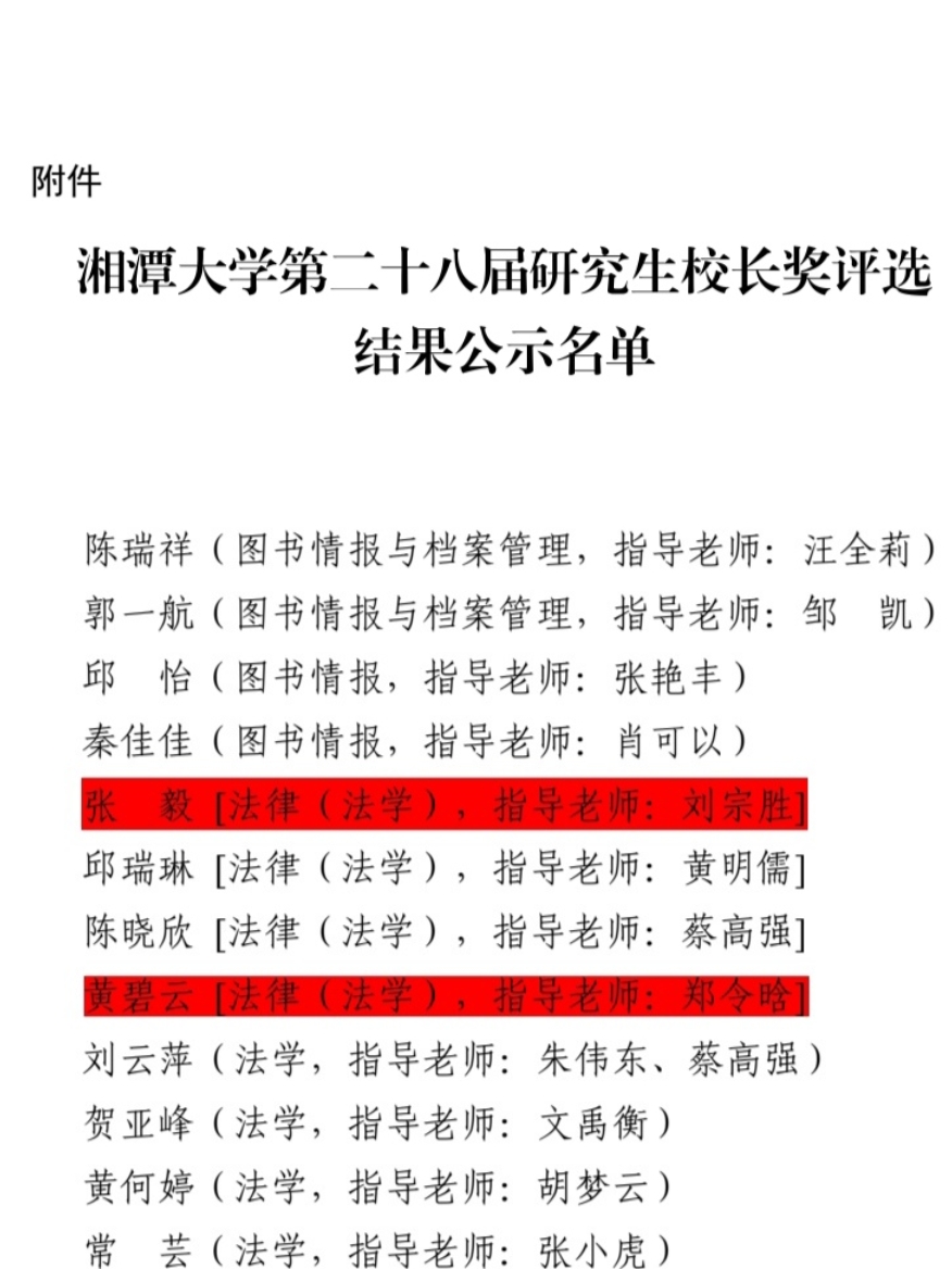 近日,湘潭大学第二十八届研究生校长奖正式公布,我院研究生张毅 [法律(法学),指导老师:刘宗胜]、黄碧云 [法律(法学),指导老师:郑令晗] 荣获优秀奖。