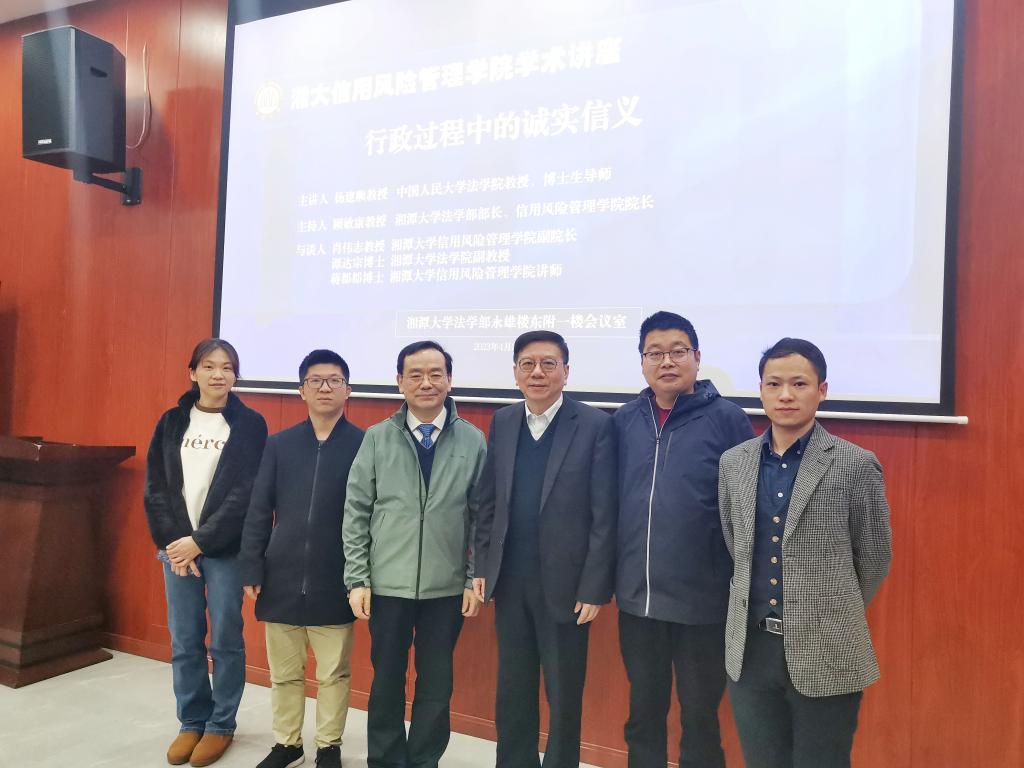 2023年4月25日上午9点,我院于法学楼东附一楼会议室举办韶风名家论坛,中国人民大学yl23455永利官网教授杨建顺应邀作为主讲人,为我院师生开展了“行政过程中的诚实信义”专题讲座。讲座由我院学部部长、信用风险管理学院院长顾敏康教授主持,与会嘉宾有:信用风险管理学院副院长肖伟志教授、谭达宗副教授、蒋都都老师。