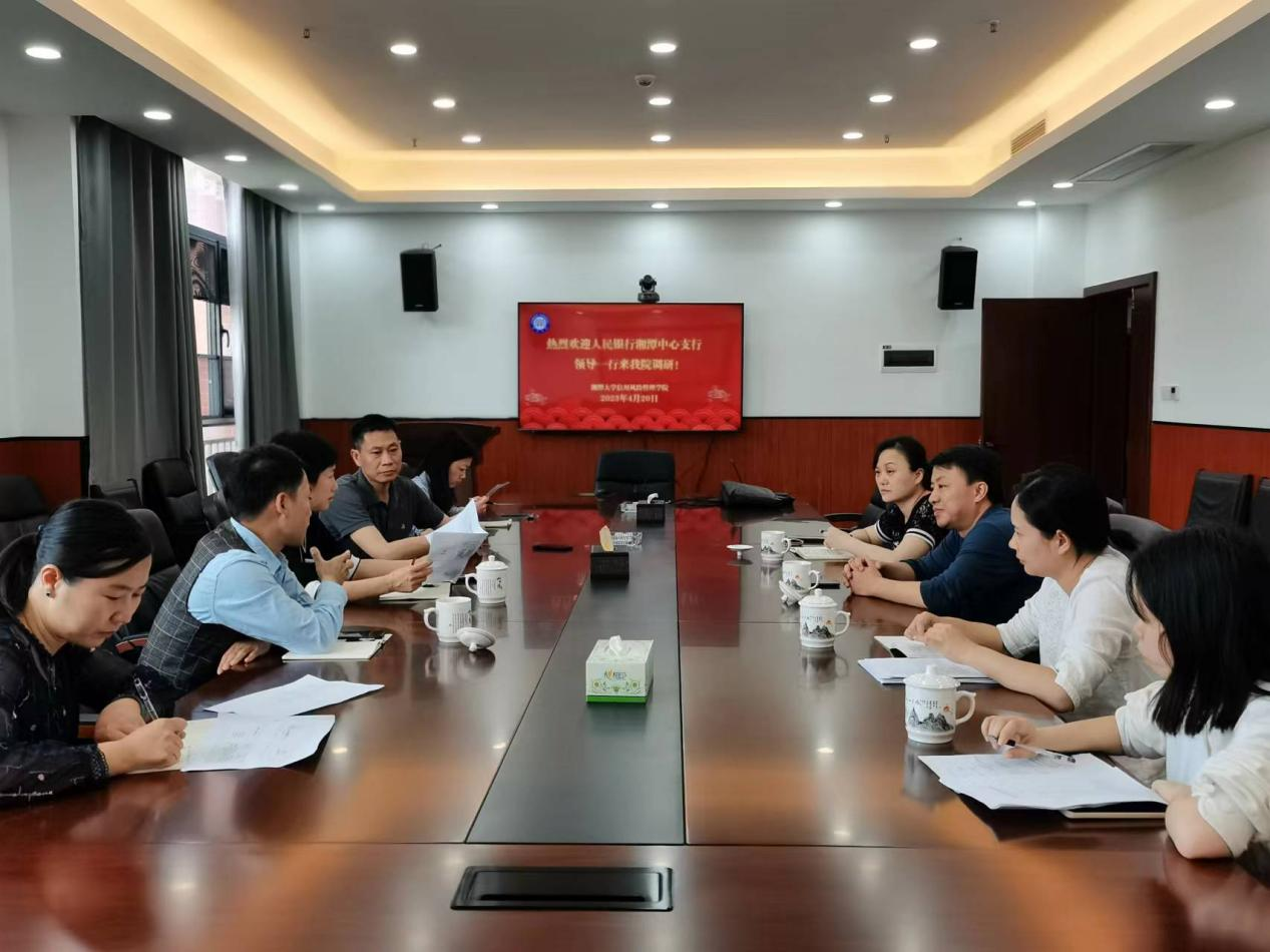 4月20日下午,中国人民银行湘潭市中心支行王伟副行长一行来我院进行考察、交流,我院易立峰书记、肖伟志副院长以及部分教师参加了座谈交流。双方就应收账款池信贷融资模式在湘潭试点工作、社会信用体系建设立法与征信法规体系衔接研究工作的开展与合作事宜进行了深入探讨和交流。