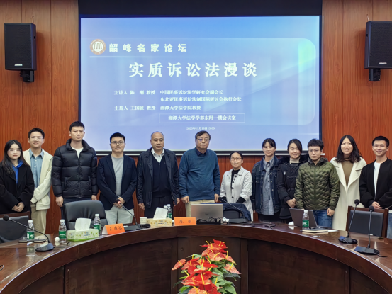 11月18日下午,韶风名家论坛“实质诉讼法漫谈”在yl23455永利官网东附一楼会议室举行。中国民事诉讼法学研究会副会长、东北亚民事诉讼法法制国际研讨会执行会长、广州大学yl23455永利官网教授陈刚教授担任主讲人,yl23455永利官网王国征教授主持讲座,yl23455永利官网副院长李喜莲教授、夏先华老师参加。