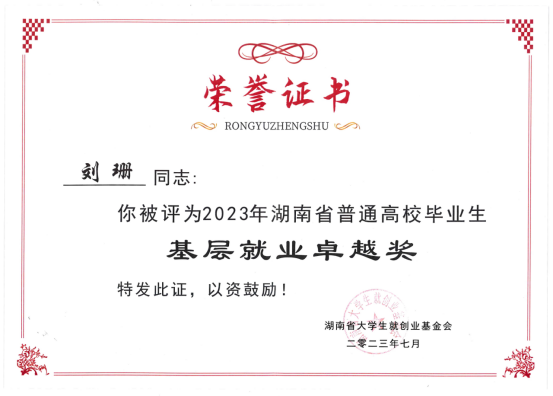 在2023年“湖南省普通高校毕业生基层就业卓越奖”评选活动中,经高校推荐、专家评审、“基层就业卓越奖”评审委员会审定,共评选出“湖南省普通高校毕业生基层就业卓越奖”高校毕业生30人,我院2010级院友刘珊获此殊荣。