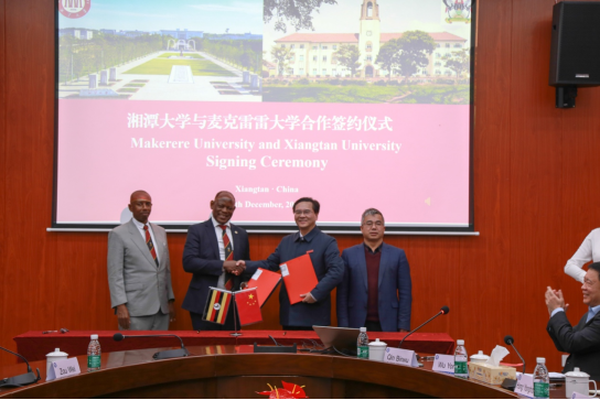 2023年12月4日,湘潭大学与麦克雷雷大学合作谅解备忘录签约仪式在法学楼东附一楼会议室举行。湘潭大学党委副书记、我院学部部长廖永安教授和麦克雷雷大学校长万格维教授(Barnabas Nawangwe),分别代表两校签署合作谅解备忘录。麦克雷雷大学孔子学院外方院长谷智博博士(Gilbert Gumoshabe)、yl23455永利官网院长欧爱民教授共同见证。出席签约仪式的嘉宾还有麦克雷雷大学语言、文学与交际学院院长萨乌达·娜米亚罗副教授(Sauda Namyalo),湘潭大学国际交流学院、我院学部、中非经贸法律研究院的主要负责人和教师代表。仪式由我院学部副部长、yl23455永利官网党委书记陈双喜主持。