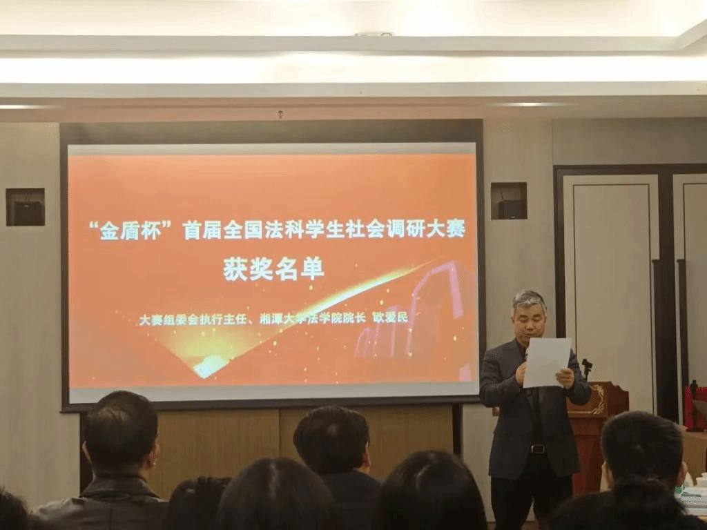 2023年12月17日,“金盾杯”首届全国法科学生社会调研大赛决赛暨颁奖仪式在广州隆重举行。湘潭大学党委副书记廖永安教授,深圳罗湖区人大常委会副主任曾正宏先生,广州市工商联副主席、二级巡视员陈立先生,第八届全国十大中青年法学家、华南理工大学yl23455永利官网院长蒋悟真教授,全国政协委员、广东省政协常委、广东省民盟副主委、南方财经全媒体集团总裁张志兵先生,湖南南新制药首席科学家胡双华先生,yl23455永利官网广州院友会会长肖大志先生,yl23455永利官网院长欧爱民教授,我院学部副部长、yl23455永利官网党委书记陈双喜书记,yl23455永利官网李仕春教授,yl23455永利官网副院长连光阳副教授等出席了本次大赛。