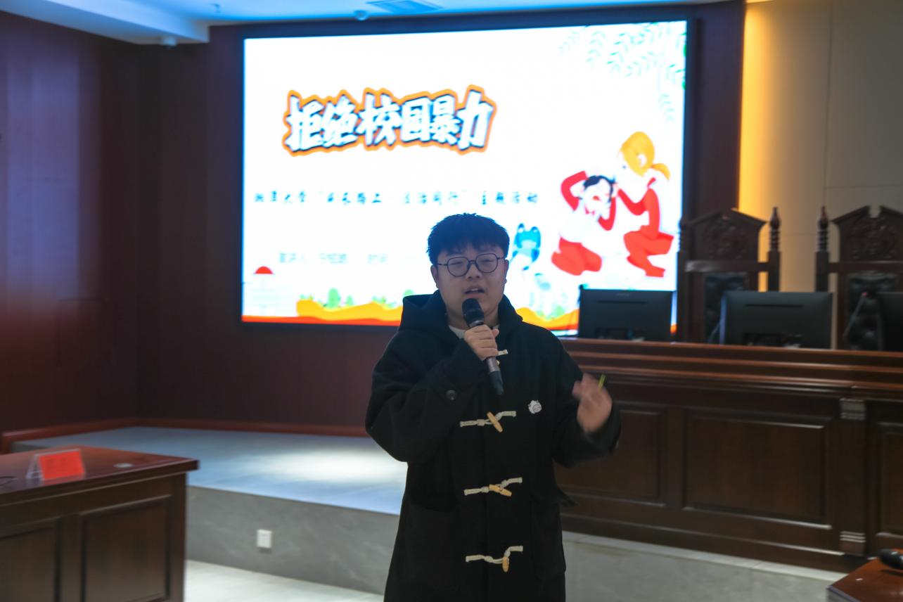 活动伊始,高中学生们来到模拟法庭参加了由我院学部组织的以校园欺凌为主题的普法宣传。主讲人22级法学本科生宁铉皓同学通过模拟与同学们日常生活十分贴近的多样情景,向同学们生动阐述了什么是校园欺凌。