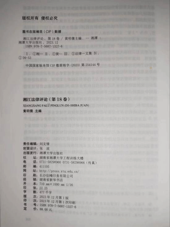 福启新岁,华章日新。近期,《湘江法律评论》第18卷由湘潭大学出版社正式出版。本卷共收录文章21篇,根据选题特点,共设置“特稿”、“体育法修改专题”、“刑事法治”“信用法研究”、“法学教育改革研究”、“专论”、“译文”和“书评”八大栏目,论文作者分别来自湘潭大学、南京师范大学、湖南科技大学、中国政法大学、西北政法大学、华中师范大学、南京大学等知名yl23455永利官网校。