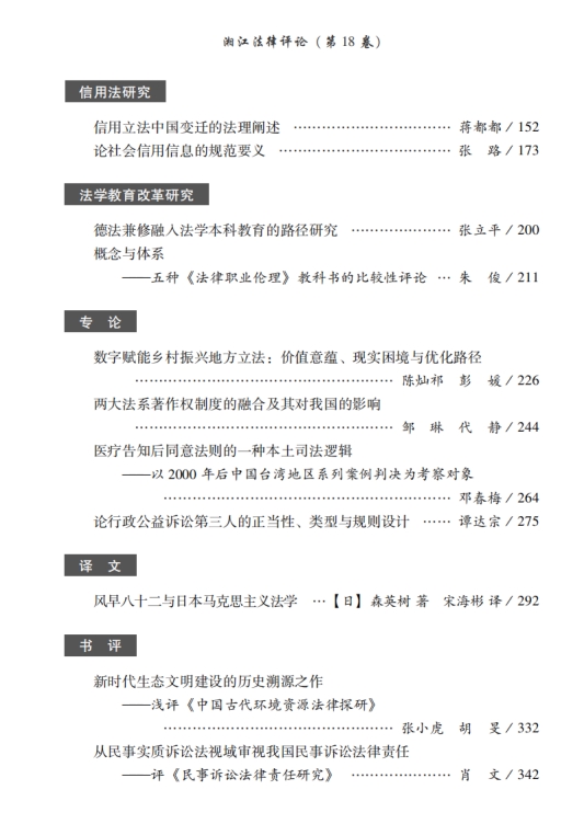 善学者尽其理,善行者究其难。“专论”一栏共收录五篇文章,主要对某一专门问题予以论述。《于右任监察思想及其当代启示》一文主要介绍了民国“监察之父”于右任的监察思想,并提出其监察思想对当代监察制度发展的启示。《数字赋能乡村振兴:价值意蕴、现实困境与优化路径》一文通过实践检视,发现数字赋能乡村振兴所存在的问题,并针对所存在的问题提出相应的优化路径。《两大法系著作权制度的融合及其对我国的影响》一文探究以英、美、法、德等国为代表的西方著作权制度的形成和发展以及对我国著作权立法及演进的影响,并在此基础上进一步完善我国相关立法,建设中国特色社会主义著作权法体系,为国际著作权制度的发展贡献自己的力量。《医疗告知后同意法则的一种本土司法逻辑——以2000年以后中国台湾地区系列案例判决为考察对象》一文通过梳理大陆及台湾两地关于“告知后同意法则”的规定发现,两地法律表述接近,但法律适用于司法层面存在较大差距,但大陆台湾政法文化一脉相通,法律意志路径基本相同,基于此,通过梳理分析台高院代表性判决中的相关表述,为大陆地区告知后同意法则的本土化发展提供参考。《论行政公益诉讼第三人的正当性、类型与规则设计》一文对行政公益诉讼是否应当引入第三人,第三人有哪些类型,具体规则如何设计这三个核心问题进行探究,并给出合理解答。