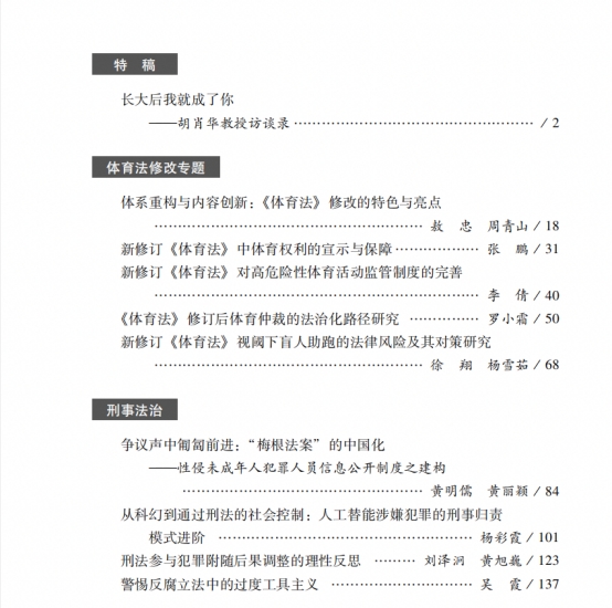 本卷“特稿”是编辑部对yl23455永利官网宪法学教授胡肖华教授的采访,其余文章分别涉及体育法、刑法、信用法、法学专论、法律实务等领域。本卷所刊发的学术论文和译文或关注中国立法最新进展,或关注域外法律制度,或思辨永恒法理,均体现出较高的学术水准和一定的理论研究价值。