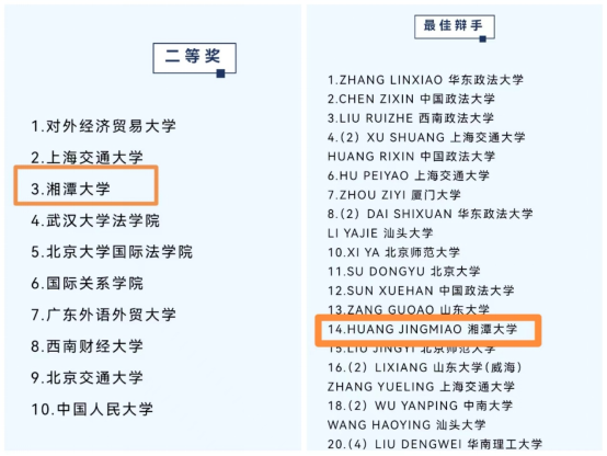 在循环赛中,湘潭大学代表队分别对阵山东大学(威海)、深圳大学、浙大宁波理工学院、对外经济贸易大学代表队,湘潭大学代表队上场队员以扎实的法律功底、流利的英语口语表达、敏捷的思维和出色的应变能力,条理清晰地阐述自己的观点,成功应对了复杂的法律问题和挑战,充分展示了他们的专业素养和团队精神,赢得了评委的一致好评,最终获得二等奖;黄靖淼同学获得最佳辩手奖项,在约300名选手中排名第14位。