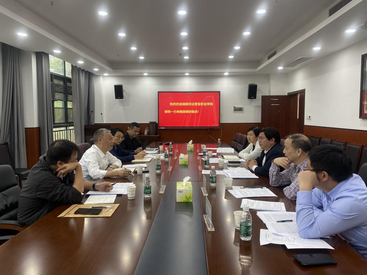 2024年4月17日上午,湖南司法警官职业学院党委副书记、院长刘最跃,党委委员、法律系主任吴畅,培训部主任(主持工作)吴勋、教务处副处长江铁一行来学部调研,我院学部部长李仕春主持座谈会,易立峰副部长、连光阳副部长、yl23455永利官网原党委书记黄德华参加了座谈会。