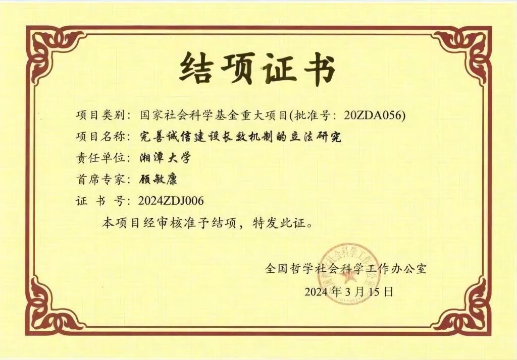 近日,湘潭大学特聘教授顾敏康主持的国家社科基金重大项目“完善诚信建设长效机制立法研究”经全国哲学社会科学工作办公室审核通过,顺利结项。