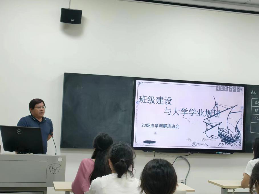 为推进班级建设工作,帮助同学们做好大学期间的学业规划,6月11日晚,2023级法学5班(调解谈判方向班)在永雄楼调解谈判教室召开“班级建设与大学学业规划”主题班会,我院学部部长、2023级法学5班班主任李仕春老师、副班主任夏先华老师和全体同学参加了本次班会。班会由夏先华老师主持,李仕春老师与同学们进行交流。