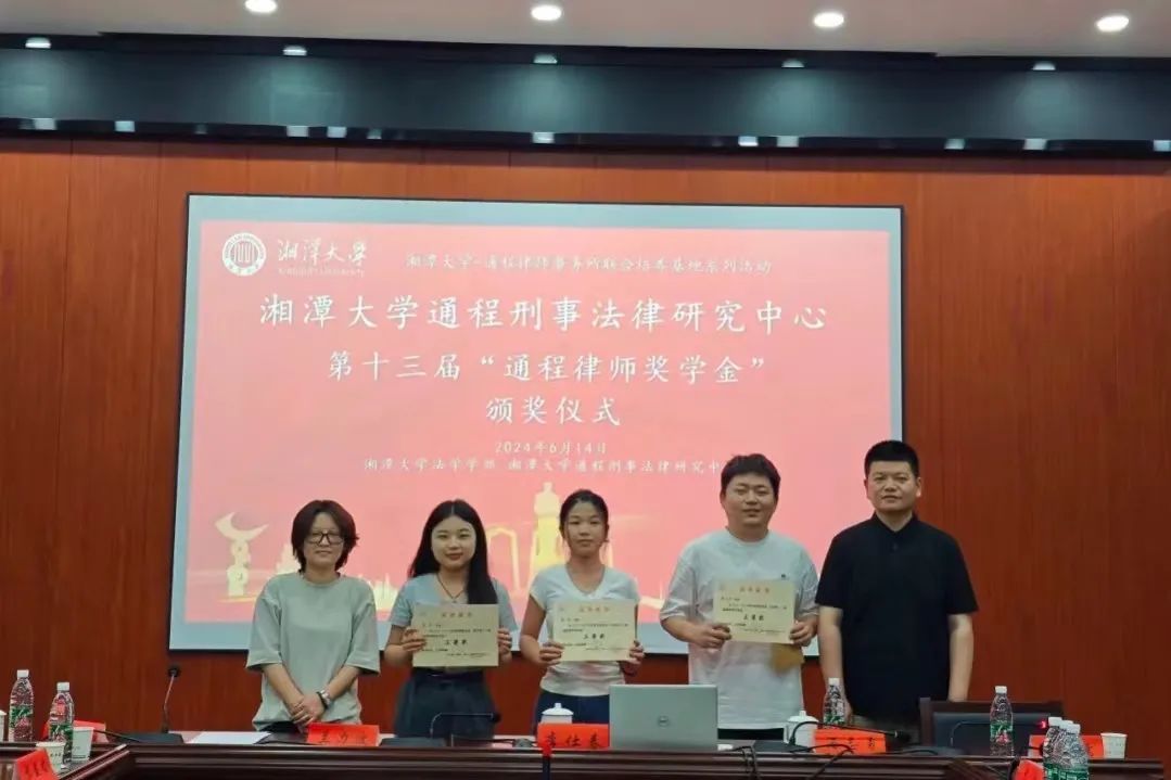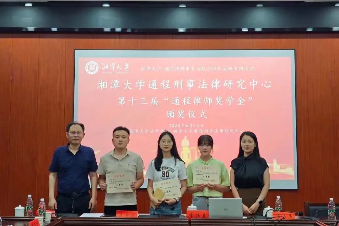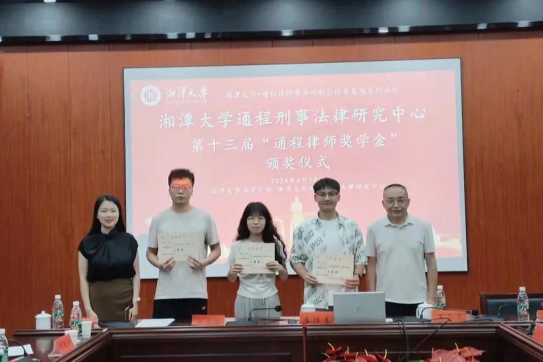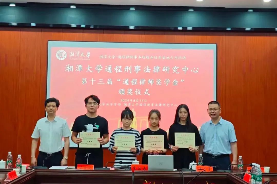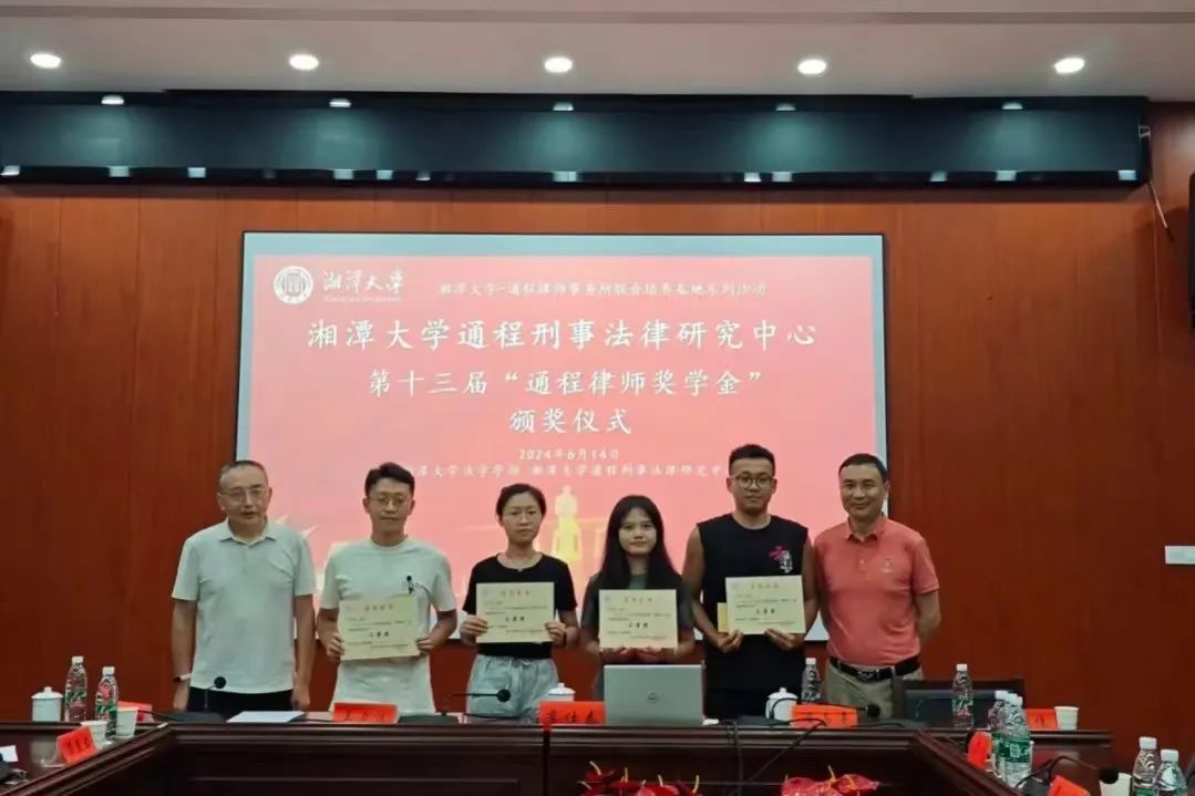 2024年6月14日下午,湘潭大学-通程律师事务所研究生联合培养基地系列活动—湘潭大学通程刑事法律研究中心第十三届“通程律师奖学金”颁奖仪式在我院学部东附一楼会议室举行。颁奖仪式由湘潭大学-通程律师事务所研究生联合培养基地执行主任、湘潭大学通程刑事法律研究中心主任、湖南省刑事法治研究会会长、我院学部博士生导师黄明儒教授主持,我院学部部长、博士生导师李仕春教授,我院学部书记陈双喜,联合培养基地主任、研究中心执行主任、研究会副会长、通程律师事务所主任兰力波律师,通程律师事务所名誉主任潘志勇律师,研究会副秘书长、通程律师事务所副主任、刑事事务部部长肖晗律师,通程律师事务所裴一霖律师、陈金磊律师,研究中心副主任、研究会学术秘书长、我院学部张永江副教授,以及我院学部万志鹏教授、王奎副教授、李兰老师等参加了本次颁奖仪式。