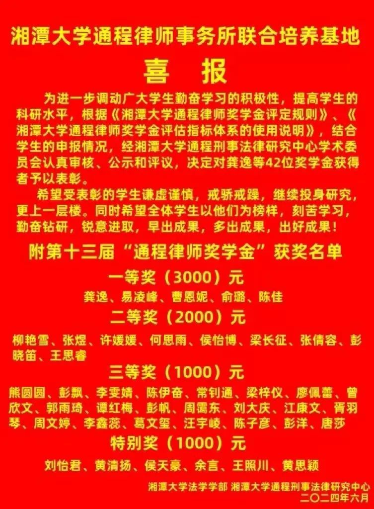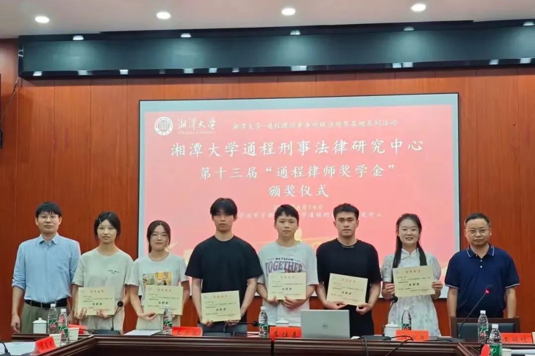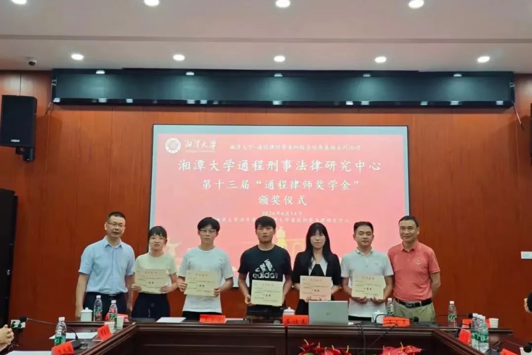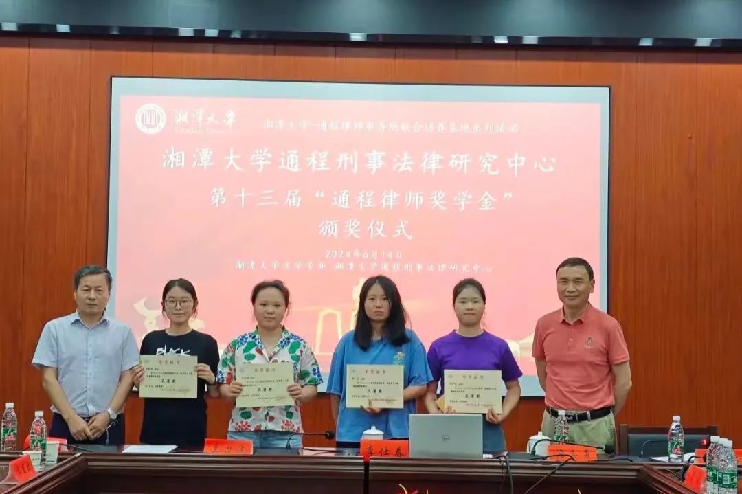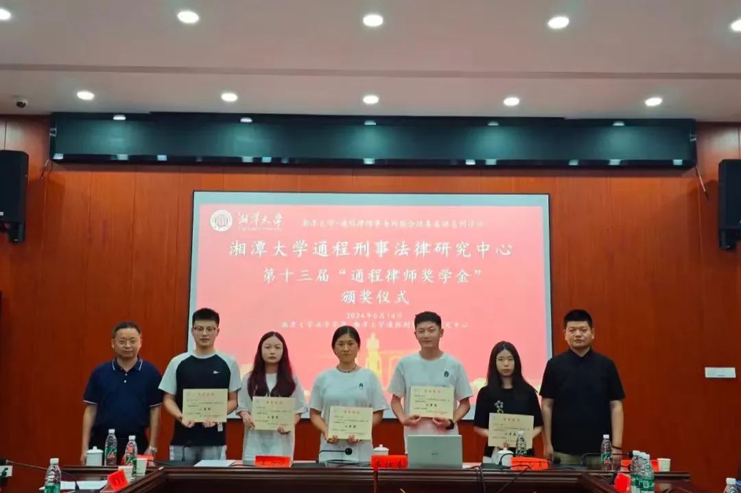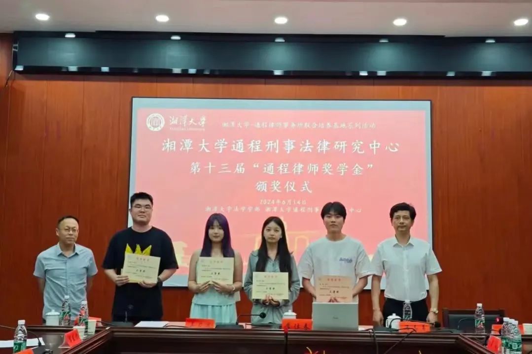 2024年6月14日下午,湘潭大学-通程律师事务所研究生联合培养基地系列活动—湘潭大学通程刑事法律研究中心第十三届“通程律师奖学金”颁奖仪式在我院学部东附一楼会议室举行。颁奖仪式由湘潭大学-通程律师事务所研究生联合培养基地执行主任、湘潭大学通程刑事法律研究中心主任、湖南省刑事法治研究会会长、我院学部博士生导师黄明儒教授主持,我院学部部长、博士生导师李仕春教授,我院学部书记陈双喜,联合培养基地主任、研究中心执行主任、研究会副会长、通程律师事务所主任兰力波律师,通程律师事务所名誉主任潘志勇律师,研究会副秘书长、通程律师事务所副主任、刑事事务部部长肖晗律师,通程律师事务所裴一霖律师、陈金磊律师,研究中心副主任、研究会学术秘书长、我院学部张永江副教授,以及我院学部万志鹏教授、王奎副教授、李兰老师等参加了本次颁奖仪式。