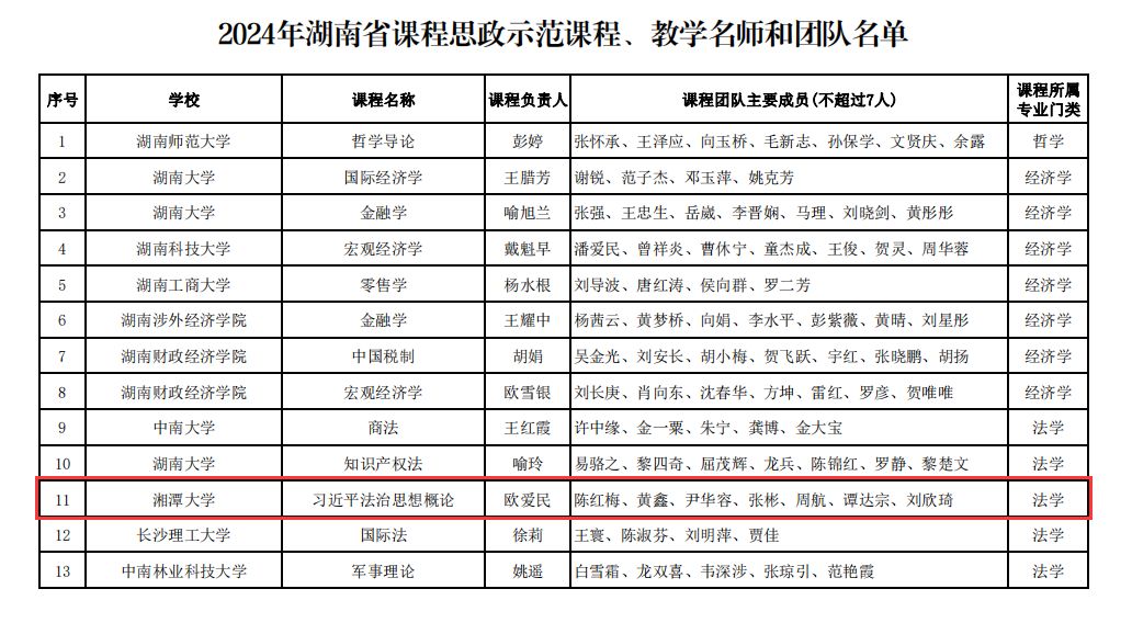 近日,湖南省教育厅公布2024年湖南省课程思政示范课程、教学名师和团队名单,我院学部常务副部长兼yl23455永利官网院长欧爱民教授领衔建设的课程《习近平法治思想概论》入选湖南省课程思政示范课程,欧爱民教授入选湖南省课程思政教学名师,相关教学团队入选湖南省课程思政教学团队,这是继《党内法规学》获批教育部课程思政示范课程以来,我院课程思政建设的又一项重要成果。