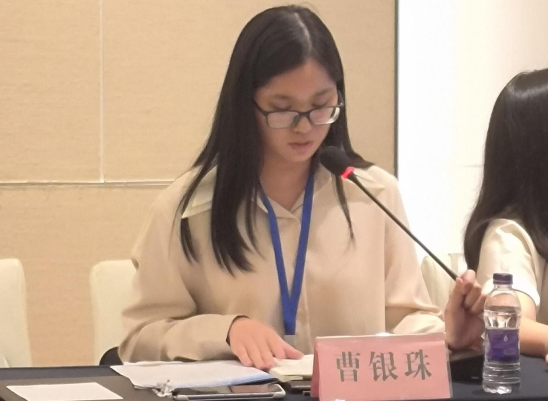 湘潭大学博士研究生曹银珠以“论湖南涉外法治人才培养的实践教学”为主题作发言。她首先指出,面对湖南省改革开放的进一步深化,特别是“三高四新”战略实施,亟需加强涉外法治人才培养,而实践教学是湖南省涉外法治人才培养重要环节。但当前的实践教学存在思政性不强、相关政策不完善、专项实习少、经费不足及理论与实践融合度不高、实习成绩评定方式不规范等问题,严重制约涉外法治人才培养。对此,她提出应提升涉外法治人才培养实践教学的思政性,制定统一的涉外法治人才培养实践教学政策,高校要加强与实践单位的密切交流合作,财政划拨涉外法治实践教学的专项经费,引导理论知识运用于实践,完善涉外法治人才培养实践教学的考评机制,为湖南省的高质量发展提供人才支撑。