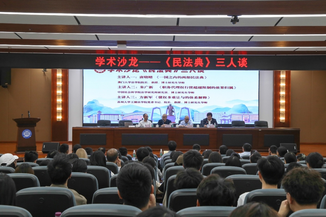 2024年10月11日,我院学部2024年第8期学术沙龙——“《民法典》三人谈”在法学楼西附一楼学术报告厅热烈举行。沙龙由我院学部部长李仕春主持,全国人大常委会澳门基本法委员会委员、澳门大学yl23455永利官网院长唐晓晴教授,苏州大学王健yl23455永利官网党委书记、院长方新军教授,中国社会科学院法学研究所研究员、《民商法论丛》副主编朱广新教授主讲,我院学部副部长肖伟志、连光阳,谢蔚、滕佳一、睢苏婕三位副教授、朱正远老师、张路老师,澳门大学yl23455永利官网博士生昝晨东以及我院学部学生200余人参加,会场座无虚席、气氛热烈。