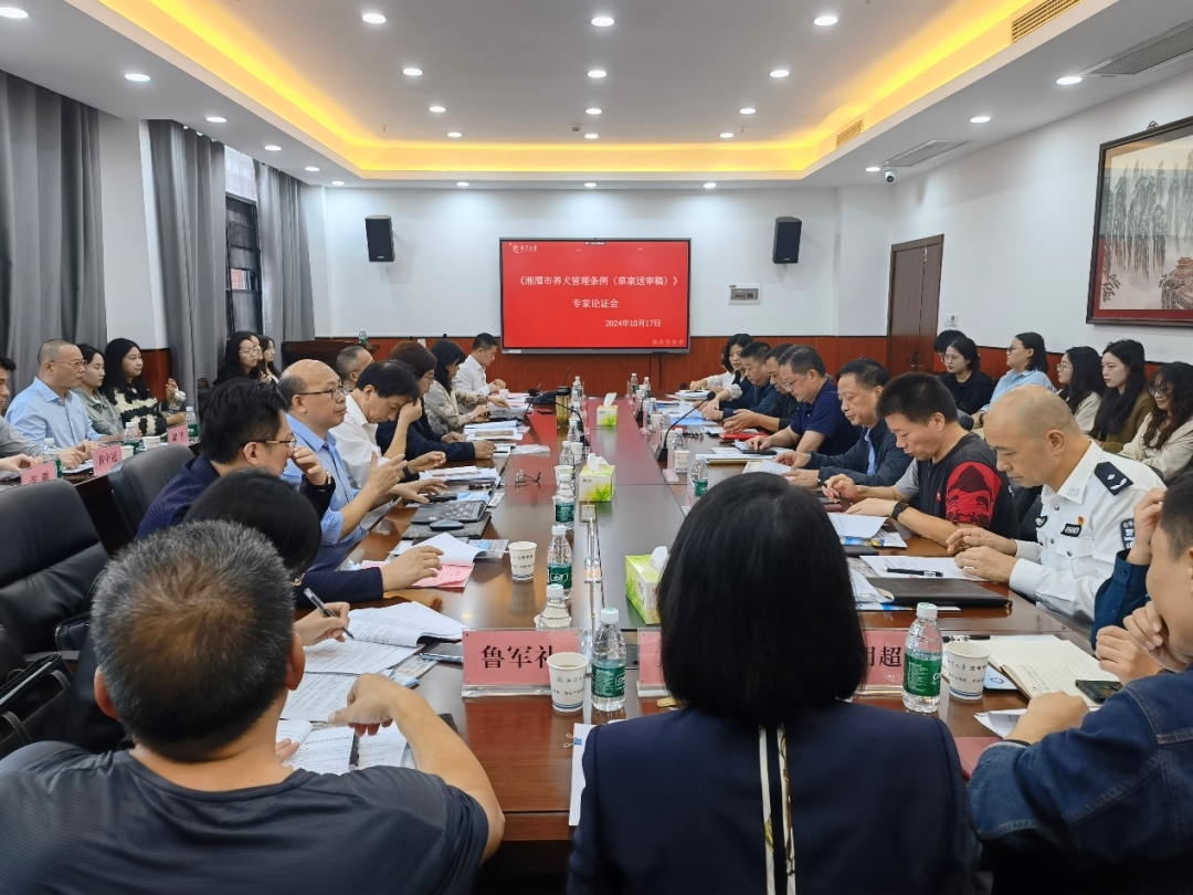 2024年10月17日上午,我院学部在法学楼204会议室举办《湘潭市养犬管理条例(草案•送审稿)》专家论证会暨2024年第12期“湘大立法专家研讨会”。