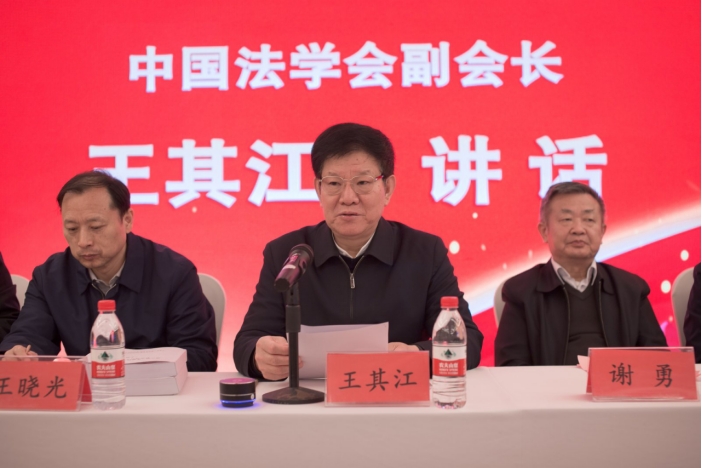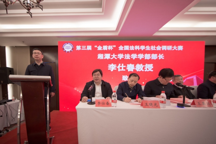中国法学会党组成员、副会长王其江作重要讲话。王其江副会长充分肯定了湘潭大学创办全国法科学生社会调研大赛的担当精神,并对法科学子们提出了三点希望:立大志,坚定习近平法治思想的正确引领;明大德,坚持德法兼修提升法治素养;担大任,努力成为新时代合格的法治人才。希望广大青年学子紧密结合新时代全面依法治国新要求,坚持问题导向、实践导向、目标导向,为推动法治理论创新、丰富法治实践形态作出积极努力,担当起当代青年应当担负的时代使命,在建设法治中国的宏伟征程中贡献青春力量。