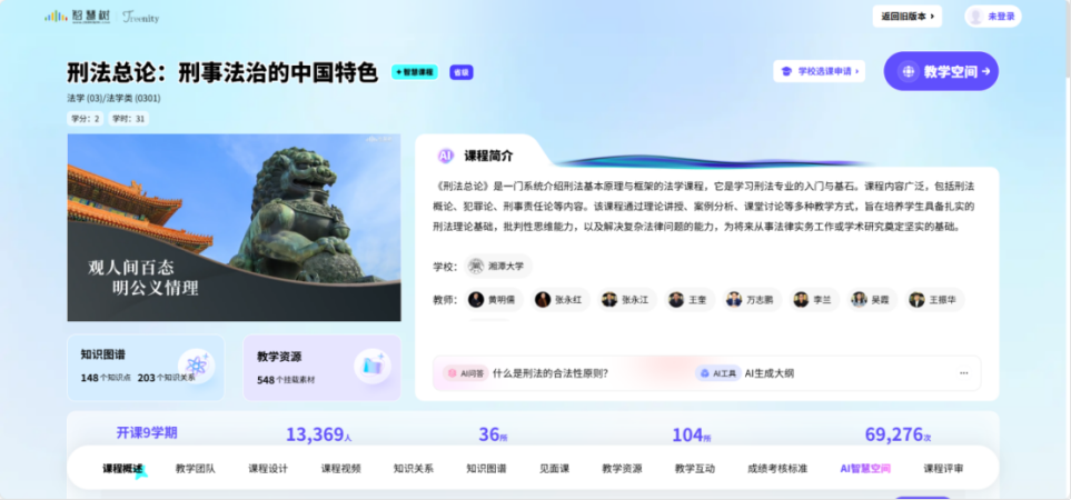 课程以湖南省一流精品课程《刑法总论:刑事法治的中国特色》为基础,深度融合AI技术,系统整合了电子教案、微课视频、模拟法庭、系统读书会及扩展阅读资料库等多元化教学资源。通过创新教学设计,课程实现了刑事法治理论与现代教育技术的有机融合,呈现出以下鲜明特色:
