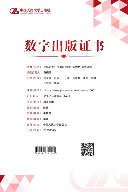 近日,学部黄明儒教授领衔主讲的数字课程《刑法总论:刑事法治的中国特色》由中国人民大学出版社正式出版上线,标志着学部在刑事法学数字化教学资源建设领域取得重要突破。
