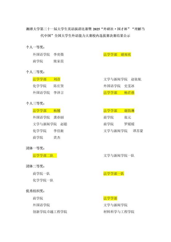 本次决赛中,我院学部派出两支队伍参赛,由五名2024级同学组成。他们在赛场上沉着自信,以扎实的英语功底、默契的团队协作和出色的临场表现,赢得了评委与观众的高度认可。面对激烈竞争,他们从容应对,凭借流畅的表达、严谨的逻辑、独到的见解结合专业的法学知识,深入阐释对“理解当代中国”这一主题的认识与思考,充分展现了法学学子的专业素养与思辨能力。最终,法学七班谢雨欣凭借优异表现斩获个人一等奖;法学卓越班刘彦、法学七班杨若愚荣获二等奖,信风一班杨翘、法学卓越班谢韵琳获得三等奖。
