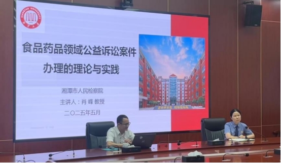 5月19日,湘潭市人民检察院举办2025年度全市公益诉讼业务培训班,培训班由湘潭市人民检察院专职委员余向阳主持,全市公益诉讼条线共40余名干警参加培训。肖峰教授应邀讲授了《食品药品领域公益诉讼案件办理的理论与实践》课程,就食药领域办案数据呈现出的工作规律,以及高质效办理本领域案件应当具有的四点认知,办理行政公益诉讼、民事公益诉讼、刑事附带民事公益诉讼案件的相关理论和实践问题,结合学理分析、法条释义和典型案件情况,为全体学员进行三个小时的细致讲解。