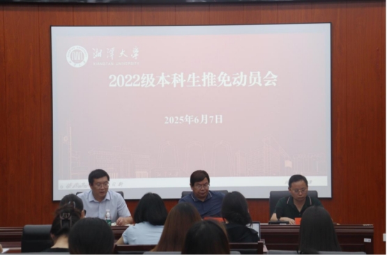 6月7日下午,我院学部在东附一楼召开2025年推免动员大会。我院学部部长李仕春、副部长连光阳、党委副书记黎益君、教务办主任王惟郅、2022级辅导员江舒瑶以及2022级有推免意向的六十余名本科生参加了会议。