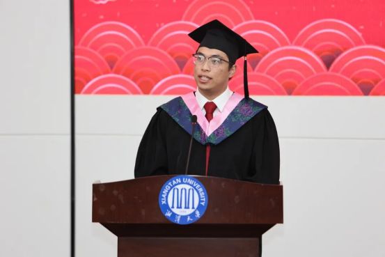 大家下午好!我是我院学部2025届本科毕业生黎诗琪。很荣幸能够作为毕业生代表,在这里同大家分享我的故事。从我第一次踏入三拱门算起,来到湘大求学、生活已经四年了。四年间,湘潭大学深厚悠远的红色底蕴熏陶着我,山清水秀的自然环境滋养着我,踏实刻苦的学风氛围感染着我,雄厚优质的教学资源哺育着我,一千多个日夜,在韶峰湘水之间,我逐渐成长为一个地地道道的湘大人。