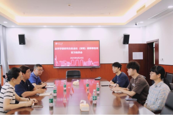 6月24日上午,我院学部在法学楼202会议室举行研究生赴金杜(深圳)律师事务所实习动员会。我院学部部长李仕春,党委书记陈双喜,研工办主任赵雨濛以及全体实习生参加此次动员会。