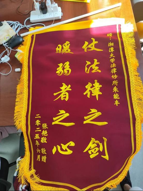 2025年7月24日,长沙市民张小姐向yl23455永利官网法律诊所办公室送达锦旗一面,以感谢yl23455永利官网法律诊所朱能丰同学在案件承办过程中的辛苦付出。
