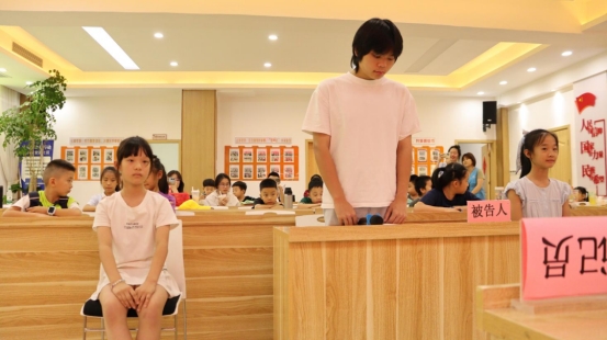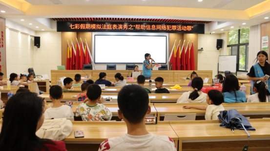 2025年7月9日,我院学部“法护童心,筑梦七彩”法韵童梦护卫队在云峰社区举办"对网诈say no:校园守护行动"主题法治教育活动。随着审判长喻诗雅敲响法槌,由大学生志愿者主演的模拟法庭表演秀正式开始,法警曾芷琳、张骞月押解被告人胡怀理入庭,50余名小学生全程观摩了这场关于帮助信息网络犯罪活动罪的庭审实践。