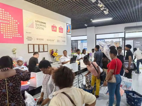 8月2日,湘潭大学坦桑尼亚研学团实地探访EACLC时观察到,首批开业的120余家商铺已陆续投入运营。其中家电、日用小商品区客流量最为密集,平均单店日接待顾客超400人次,收银台区域人头攒动。值得注意的是,约85%在售商品为中国制造,包括海信电视、海尔家电等。