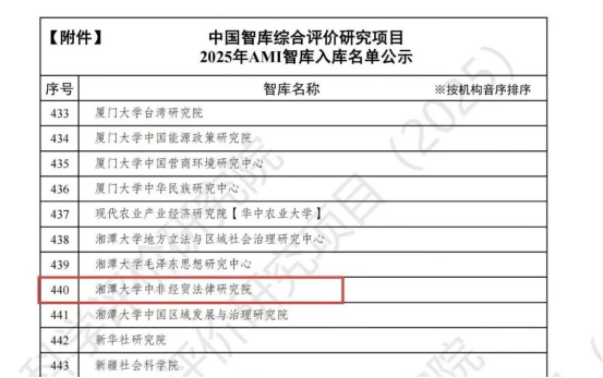 近日,中国社会科学评价研究院公示了“中国智库综合评价研究项目2025年AMI智库入库名单”,“湘潭大学中非经贸法律研究院”智库成功入选。此次入选,是对湘潭大学中非研究院智库整体建设工作的高度认可,并将为湘潭大学中非研究院在中非经贸法律研究及相关领域发挥更大作用提供更广阔的平台。