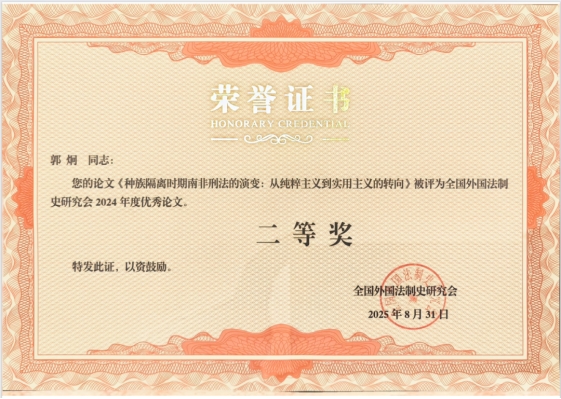在闭幕式的首个环节——全国外国法制史研究会2024年度优秀论文颁奖典礼上,我院学部讲师郭炯的论文《种族隔离时期南非刑法的演变:从纯粹主义到实用主义的转向》获评全国外国法制史研究会2024年度优秀论文二等奖。