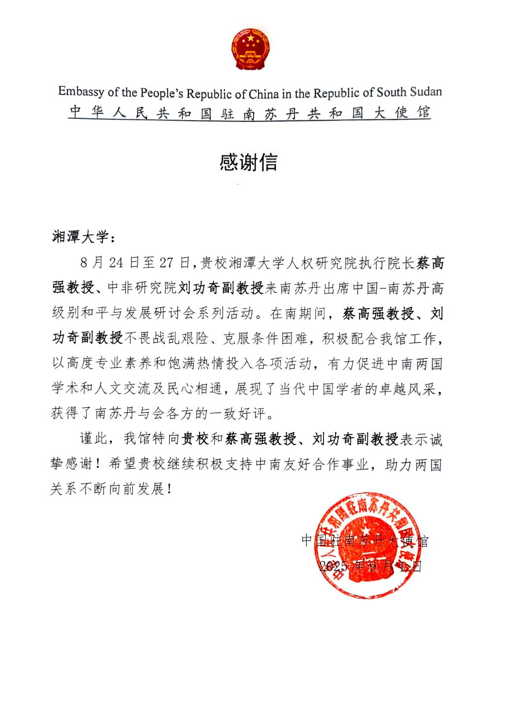 近日,中国驻南苏丹大使馆向湘潭大学发来感谢信,向学部蔡高强教授、刘功奇副教授赴南苏丹参加“中国-南苏丹高级别和平与发展研讨会”并参与系列调研活动表示感谢。大使馆认为蔡高强教授、刘功奇副教授在南苏丹期间,不畏战乱艰险、克服条件困难、积极配合使馆工作,以高度专业素养和饱满热情投入各项活动,有力促进了中南两国学术和人文交流及民心相通,展现了当代中国学者的卓越风采,获得了南苏丹与会各方的一致好评。