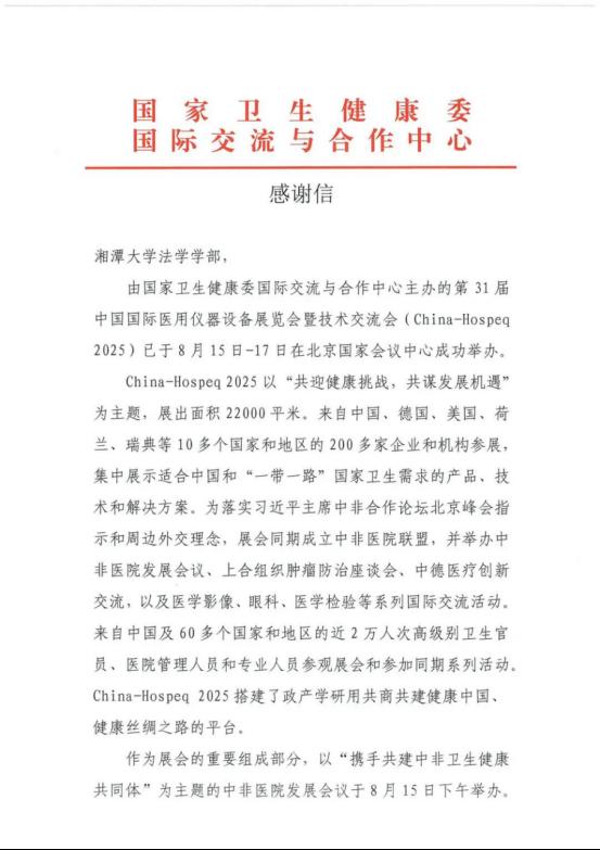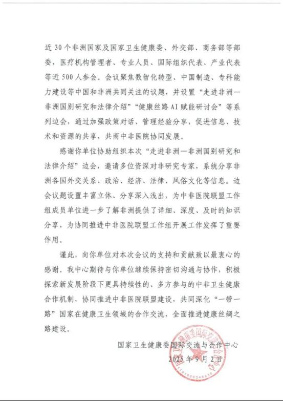 谨此,向你单位对本次会议的支持和贡献致以最衷心的感谢。我中心期待与你单位继续保持密切沟通与协作,积极探索新发展阶段下更具持续性的、多方参与的中非卫生健康合作机制,协同推进中非医院联盟建设,共同深化“一带一路”国家在健康卫生领域的合作交流,全面推进健康丝绸之路建设。