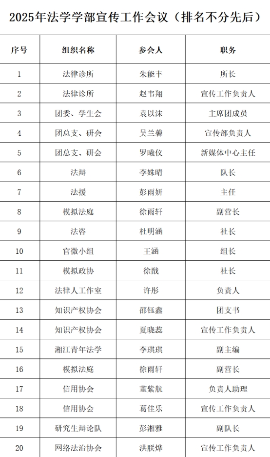 2025年9月24日中午,我院学部宣传工作会议在法学楼202会议室顺利召开。我院学部部长李仕春,团委书记、学工办主任史崧正,研工办主任赵雨濛,新媒体办段煜希老师以及各学生组织宣传部门负责人(具体名单附后)齐聚一堂,共同谋划学部宣传事业发展新篇章。