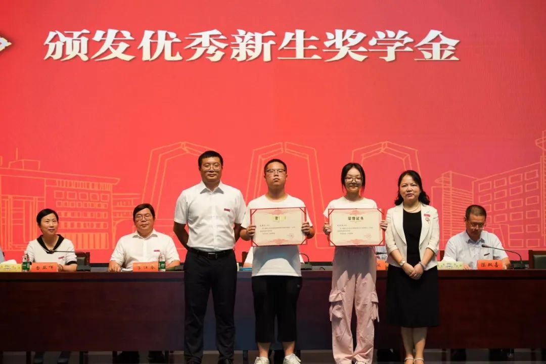 上午9时,开学典礼在雄壮的国歌声中拉开帷幕。黎益君副书记宣读《我院学部关于表彰优秀新生奖学金获得者的决定》,连光阳、尹湘南为获得“优秀新生奖学金”的刘承明、高慕仪同学颁奖。