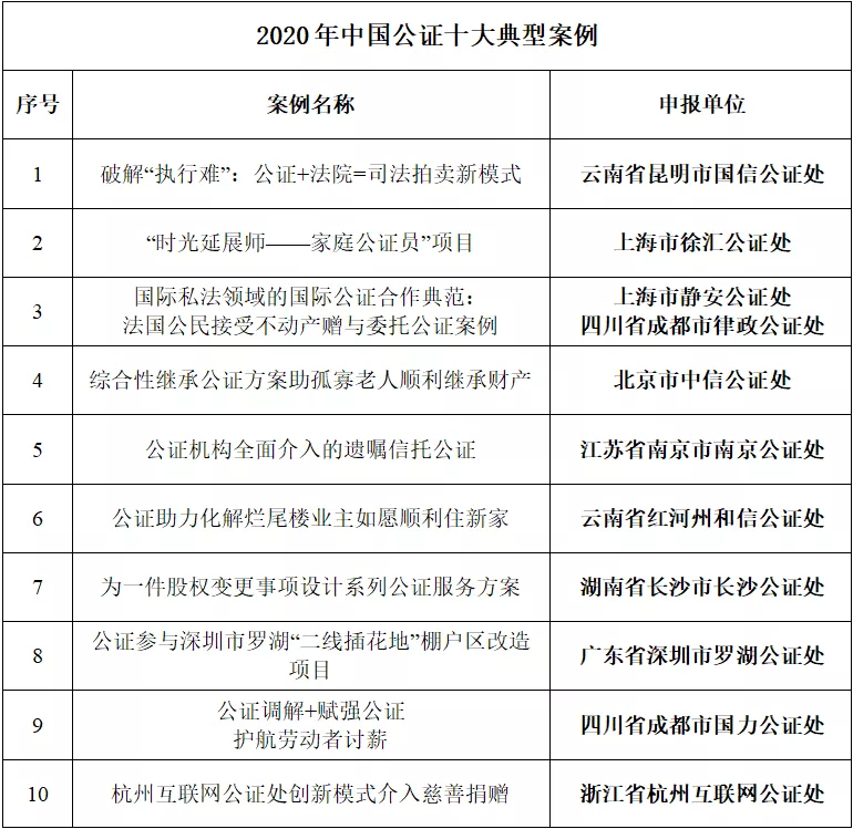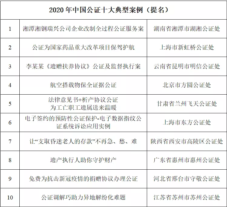 1月10日,在首届中国公证改革发展高端专题研讨会上,湘潭大学司法部公证理论研究与人才培训基地发布了“2020年度中国公证十大典型案例”。其中 “破解执行难:公证+法院=司法拍卖新模式”等10个案例被评为十大典型案例,“湘潭湘钢瑞兴公司企业改制全过程公证服务案”等10个案例获得十大典型案例提名。