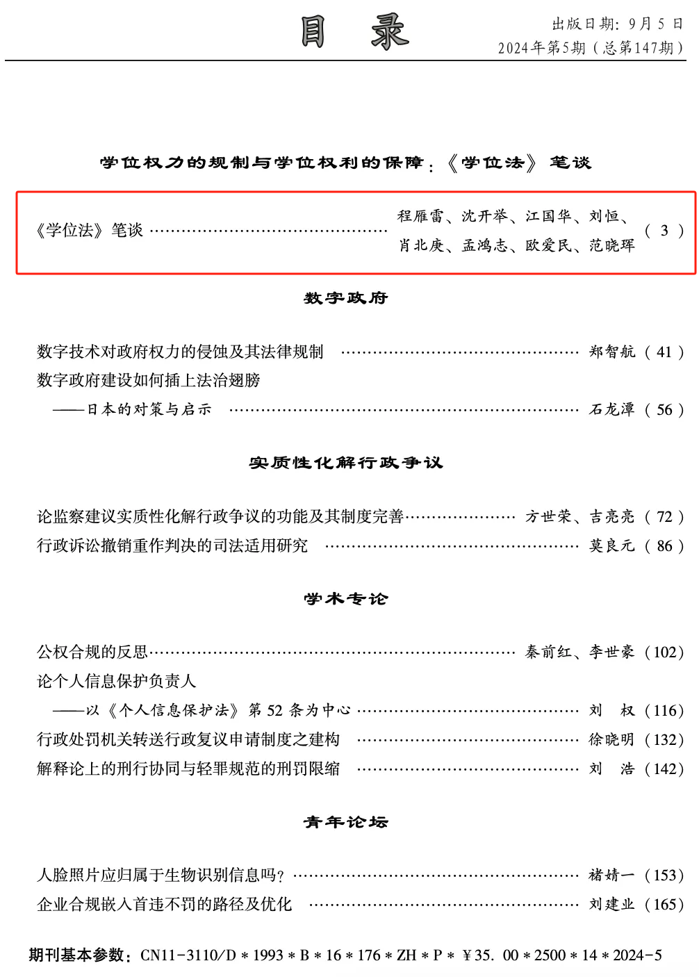 欧爱民教授、博士研究生范晓珲论文刊发中国法学核心来源期刊(CLSCI)《行政法学研究》