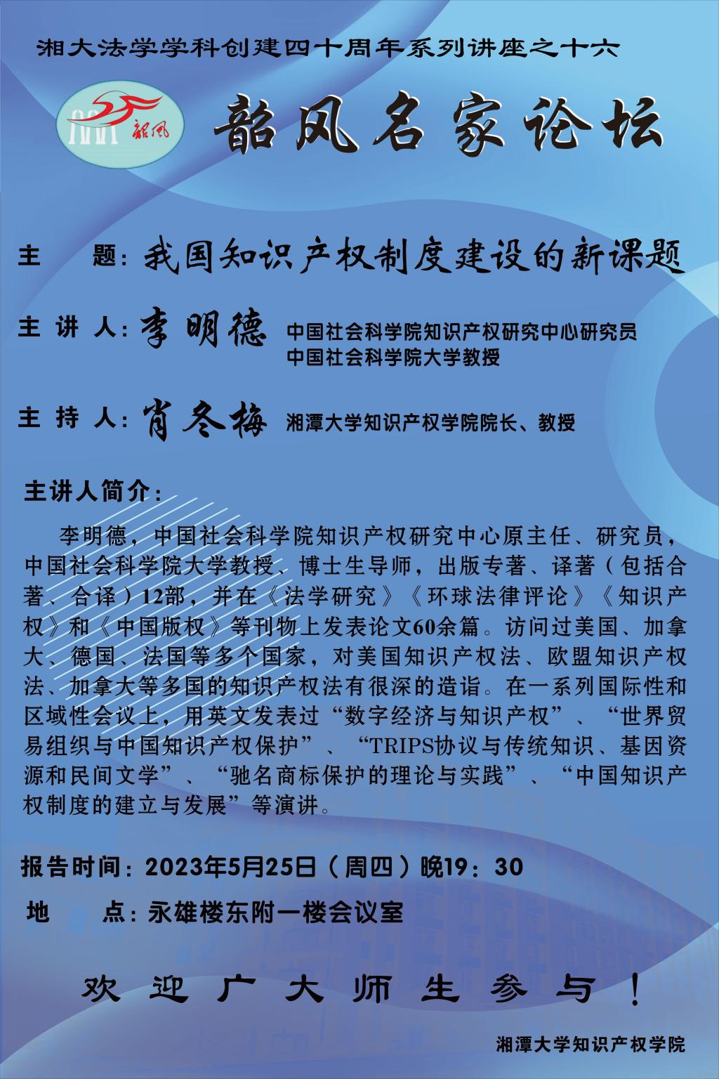 【yl23455永利官网学学科创建四十周年系列讲座之十六】李明德:我国知识产权制度建设的新课题