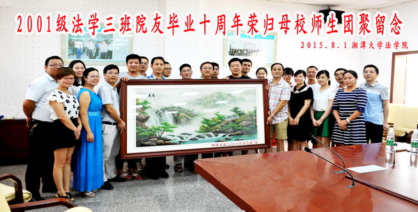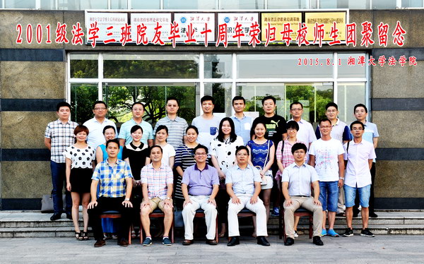 2015年8月1日,我院2001级法学3班的院友们回到阔别已久的母校,共庆毕业十周年,追忆同窗旧事,畅谈人生感悟,展望美好未来。副校长廖永安、党委书记黄德华、班主任尹华容副教授、办公室主任田坤老师、学工办吴谨老师出席了此次聚会。