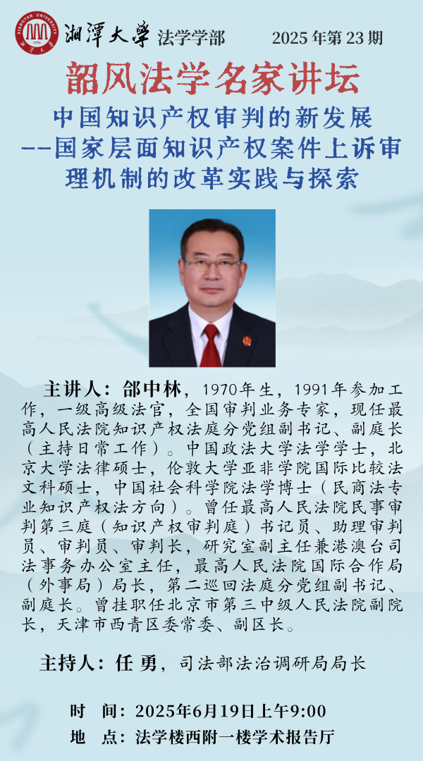【韶风我院名家讲坛】2025年第23期 郃中林:中国知识产权审判的新发展--国家层面知识产权案件上诉审理机制的改革实践与探索