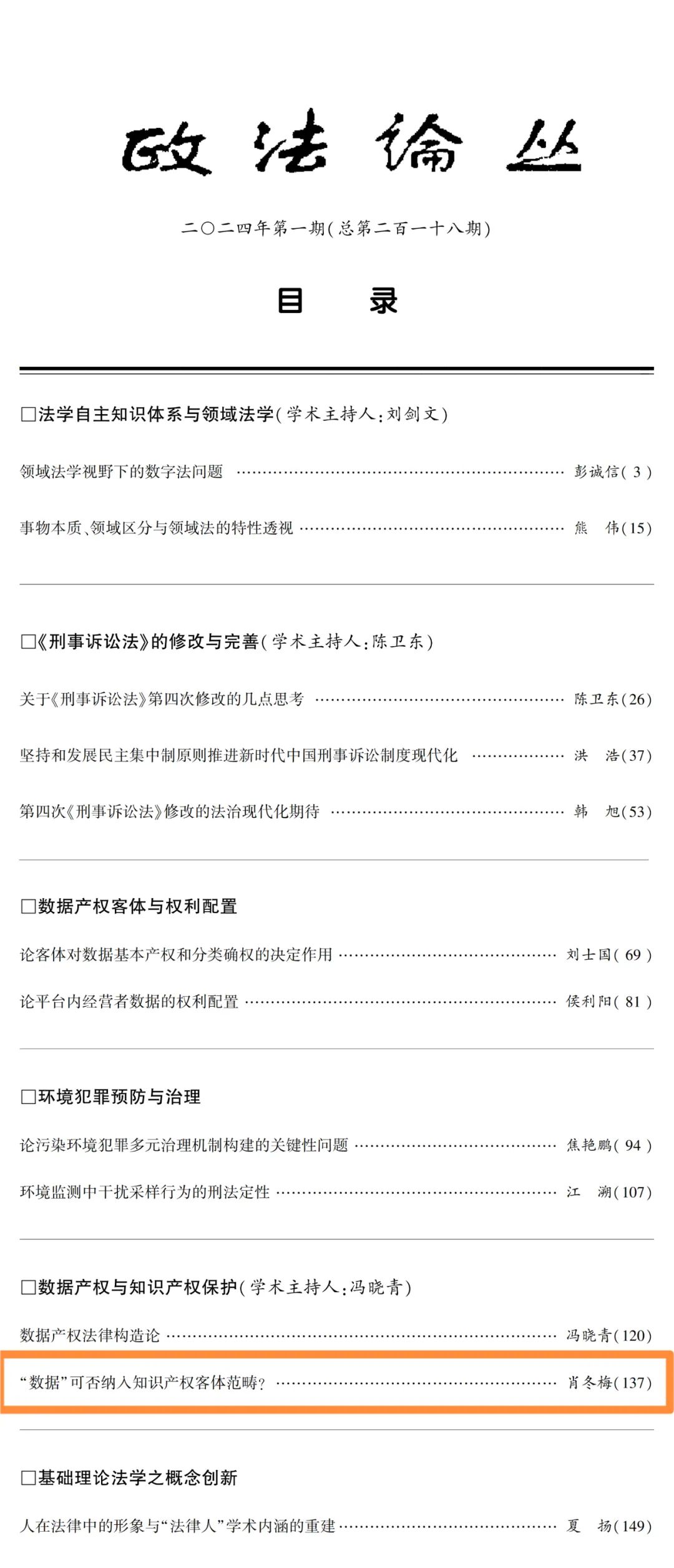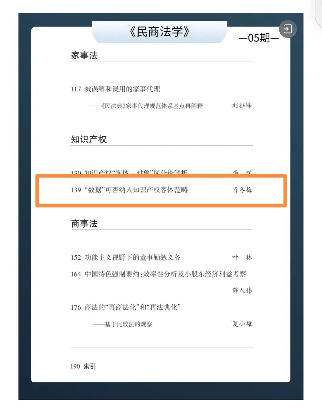近日,湘潭大学肖冬梅教授的论文《"数据"可否纳入知识产权客体范畴?》被人大复印报刊资料《民商法学》2024年第5期全文转载。该文原载于《政法论丛》2024年第1期。