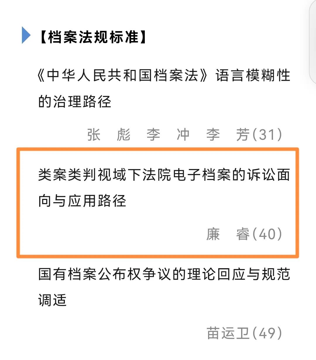 近日,我院学部廉睿副教授的论文《类案类判视域下法院电子档案的诉讼面向与应用路径》在《档案学研究》(CSSCI来源期刊)2024年第4期刊发。