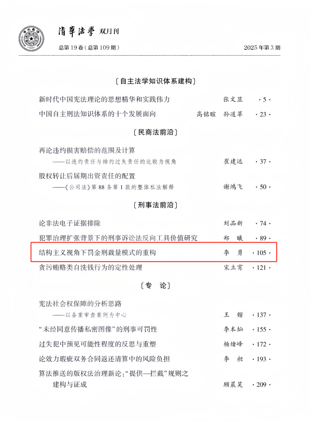 近日,我院学部特聘教授、江苏省南京市人民检察院法律政策研究室主任在CLSCI来源期刊《清华法学》2025年第3期发表论文《结构主义视角下罚金刑裁量模式的重构》。
