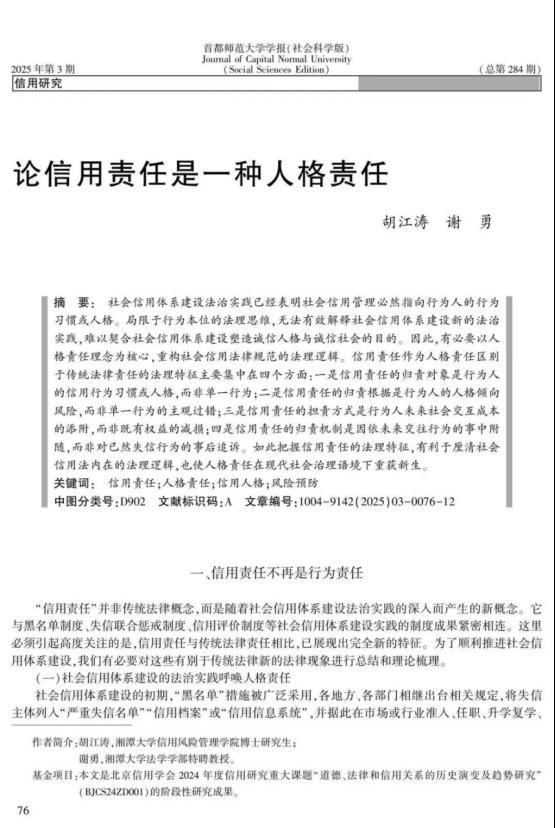 我部博士研究生胡江涛、特聘教授谢勇在CSSCI来源期刊《首都师范大学学报(社会科学版)》发表论文